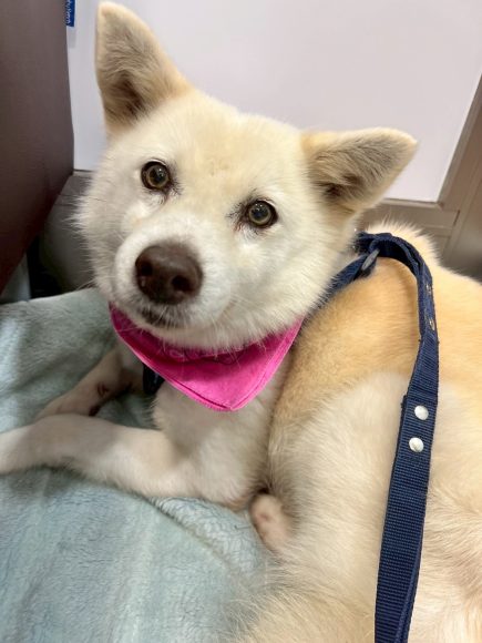 真っ白いふわふわの毛と綺麗な色をした瞳がチャームポイント!少し人見知りで控えめな大人しい小柄の女の子です!