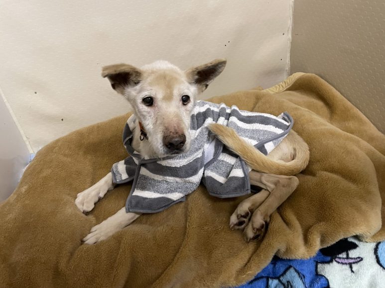クリーム色の毛色と大きめな耳、くりくりした目が可愛いらしいおじいちゃんわんこです🐶
