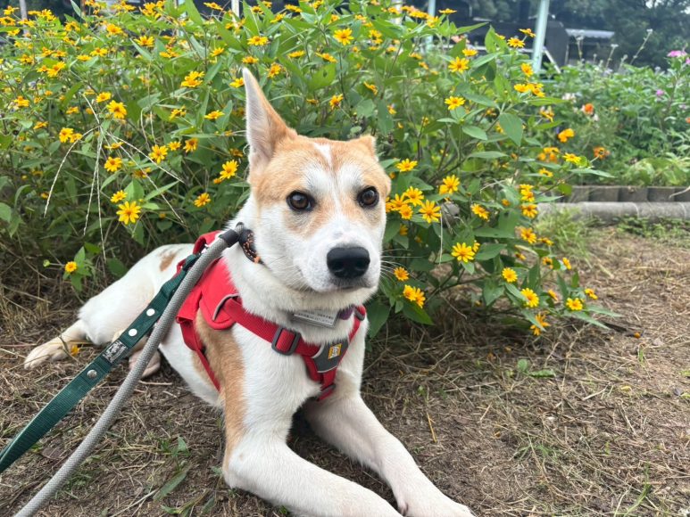 お散歩は車やバイク、通行人などまだまだアビーにとって怖いものが多いため、頑張って練習中です!他のわんこと一緒の時は少しずつ歩けるようになってきました✨