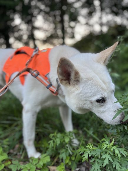 【お散歩】まだ静かな環境でしか散歩経験がありませんが、周りの匂いを嗅ぎながら楽しそうに歩きます。